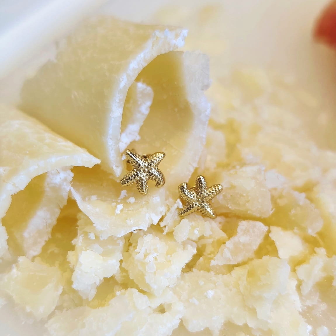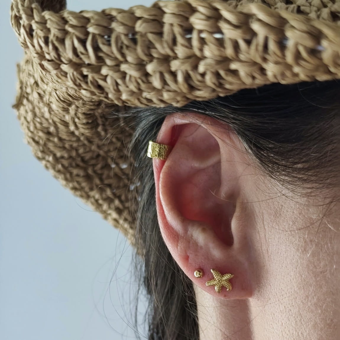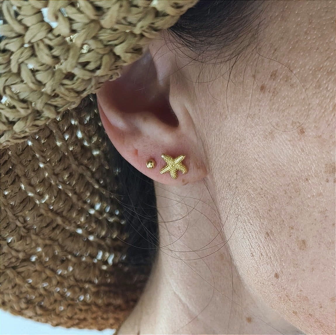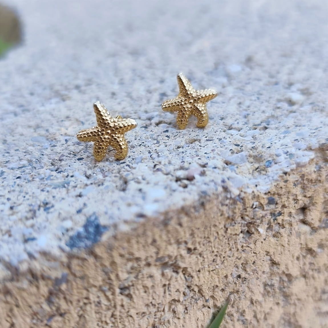 Kolczyki w kształcie rozgwiazdy, na sztyfcie. W pełni wykonane ze srebra próby 925, pozłacanego 24 karatowym, żółtym złotem.