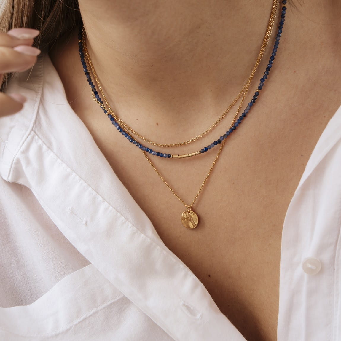 Naszyjnik prezentuje się na dekolcie zjawiskowo i wygląda bardzo kobieco. Granatowy odcień kamieni sodalitu sprawia, że naszyjnik wygląda niezwykle oryginalnie, a błysk kamieni dodaje elegancji. To nasza polecajka jako must have, który warto mieć wśród swojej biżuterii. Świetnie kompletuje się łańcuszkami, polecamy szczególnie naszyjnik z monetką i naszyjnik z zawieszką księżyc.