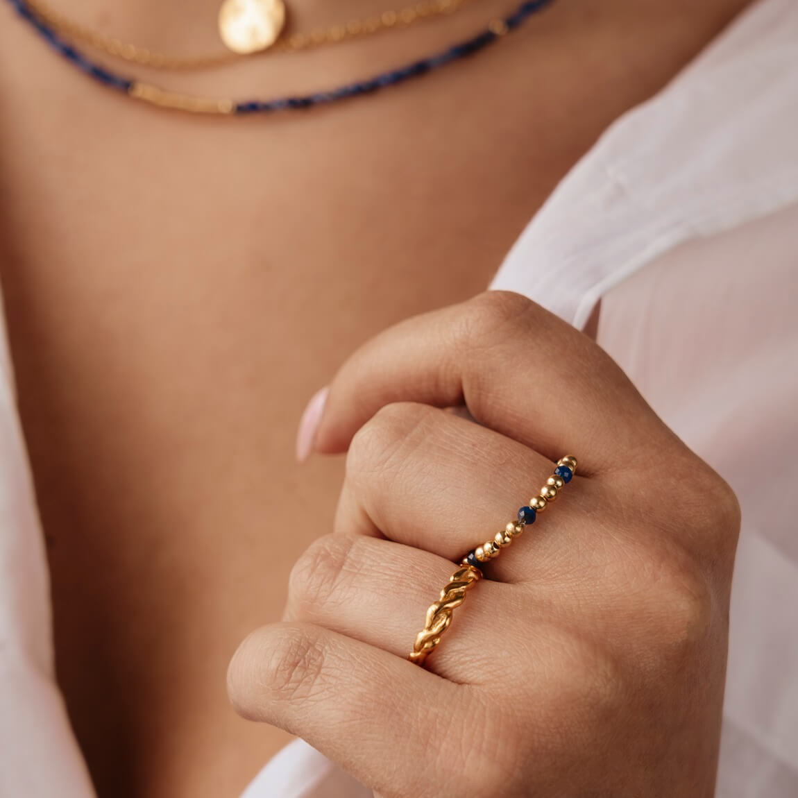 Pierścionek wykonany ze srebrnych kuleczek pokrytych mikronami 24 karatowego, żółtego złota oraz z kamieni sodalitu. Pierścionek na gumce elastycznej.